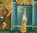 Темницею и гладом изнуряем,/ даже до смерти верен пребыл еси, блаженне Ермогене,/ малодушие от сердец людей твоих отгоняя/ и на общий подвиг вся призывая./ Темже и нечестивых мятеж низложил еси и страну нашу утвердил еси,/ да вси зовем ти:// радуйся, заступниче Российския земли.