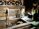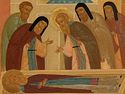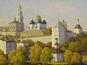 Взирающе на предлежащий честный твой гроб,/ в немже скрыся, яко многоценное сокровище, святое трудолюбное твое тело чистоты,/ мы, чада твоя суще жалостная,/ в удивлении един со единем вещающе, вопием:/ отче наш Сергие, моли Святую Троицу/ и нам спастися, твоим чадом.
