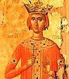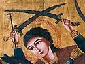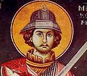 Во бранех непобедимаго воина/ и в бедах непостыдна заступника,/ песньми Меркурия ублажим, славяще,/ празднующия бо память его весело// от бед избавляет и скорбей.